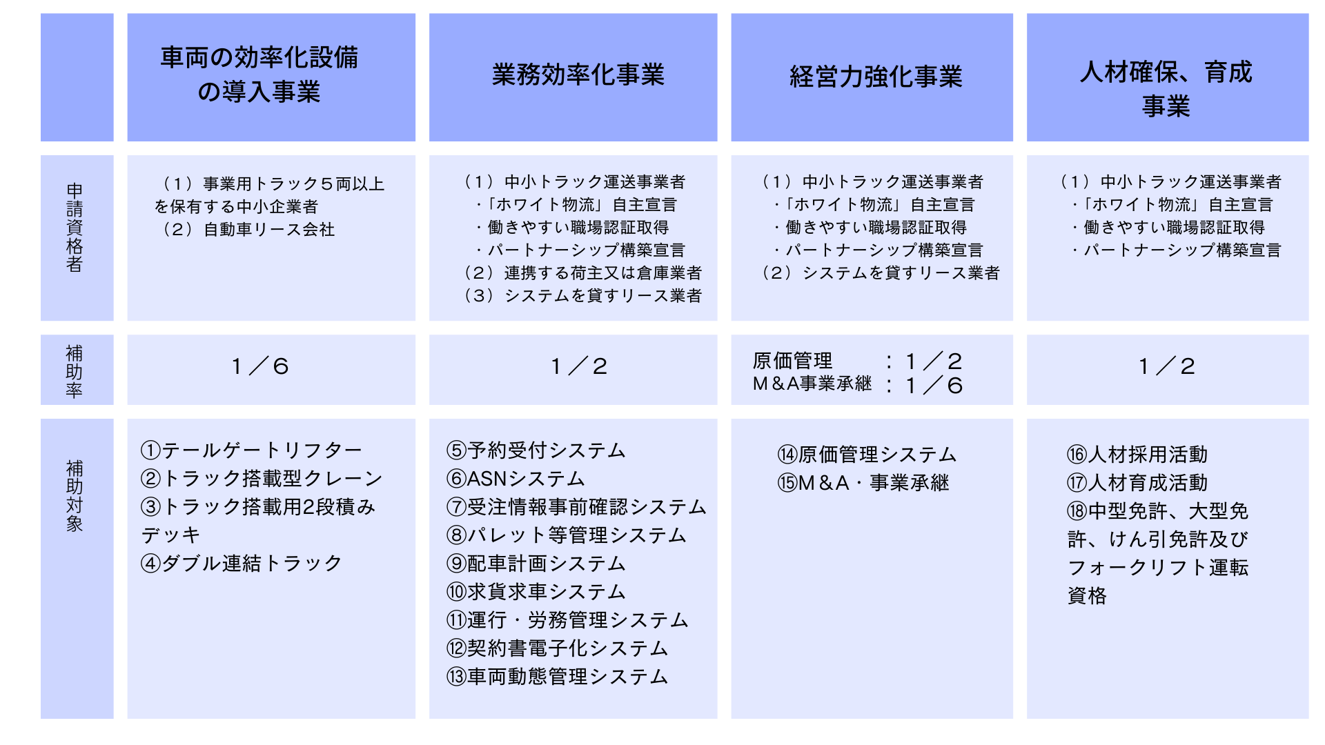 支援内容 ①車両の効率化設備の導入事業、②業務効率化事業、③経営力強化事業、④人材確保、育成事業