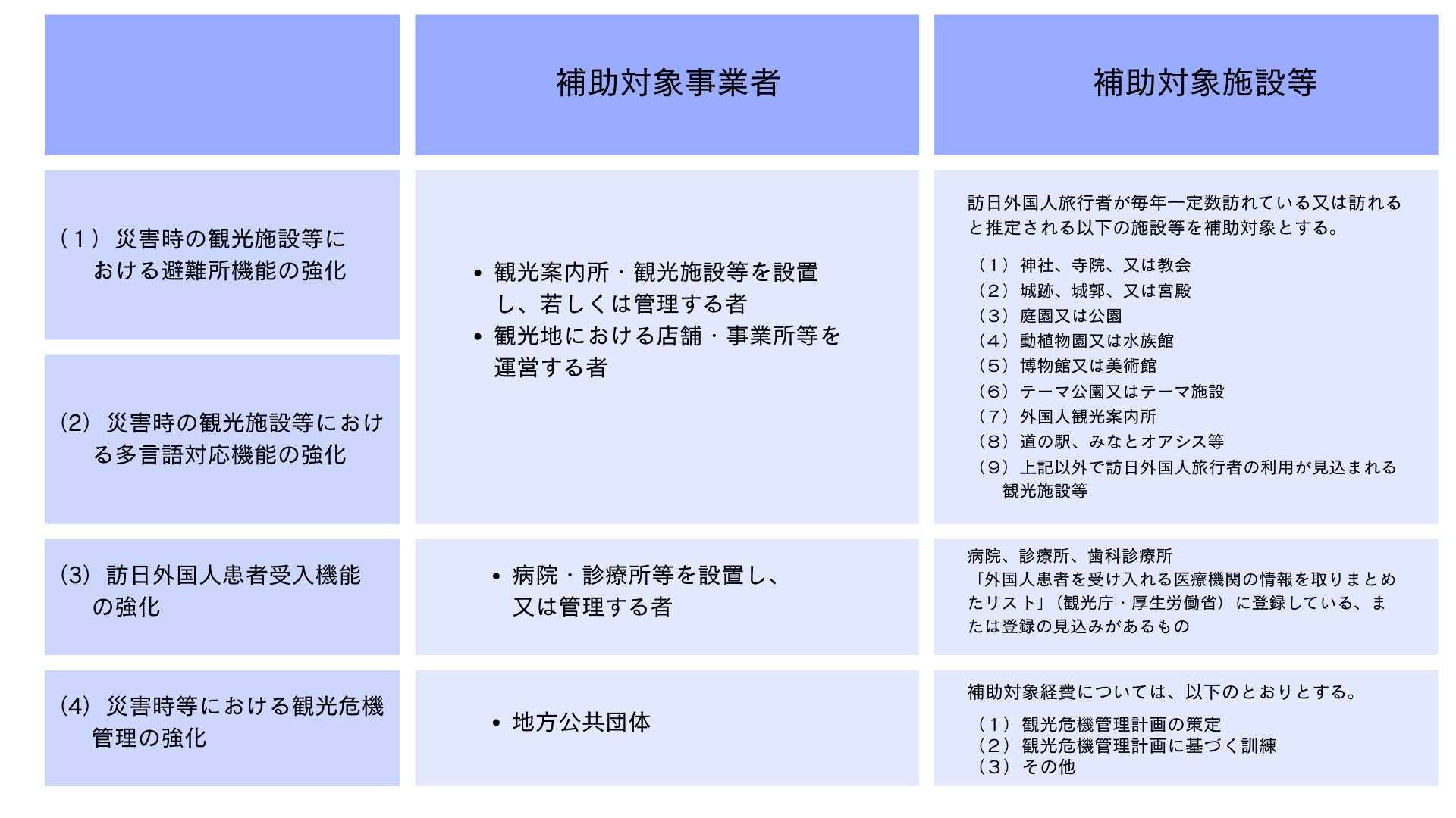 補助内容は、大きく三つに分かれます。①地域における観光危機管理計画の策定、②観光施設等における避難所機能や多言語対応機能の強化、③医療機関における訪日外国人患者の受入機能の強化です。対象となるのは、地方公共団体、観光施設などを運営する民間事業者、DMO(観光地域づくり法人)、医療機関などです。